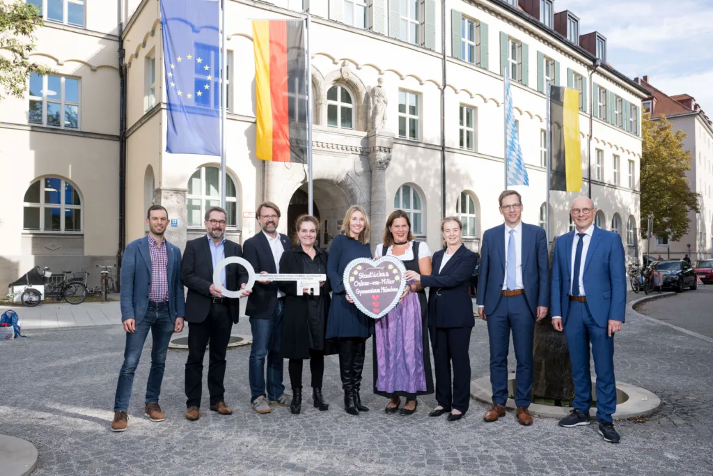 Einweihungsfeier für das generalsanierte Oskar-von-Miller-Gymnasiums mit (v.l.) Stadtrat Florian Schönemann, Stadtdirektor Detlev Langer, Stadtschulrat Florian Kraus, Baureferentin Jeanne-Marie Dr.-Ing. Ehbauer, Staatsministerin Anna Stolz, Bürgermeisterin Verena Dietl, Schulleiterin Angelika Schneider, Konrektor Michael Haider und Ministerialbeauftragter Gerhard Maier. (Foto: Referat für Bildung und Sport / Tobias Hase) Tradition trifft Moderne: Außen Denkmal, innen 2.0 Nach fünfjähriger