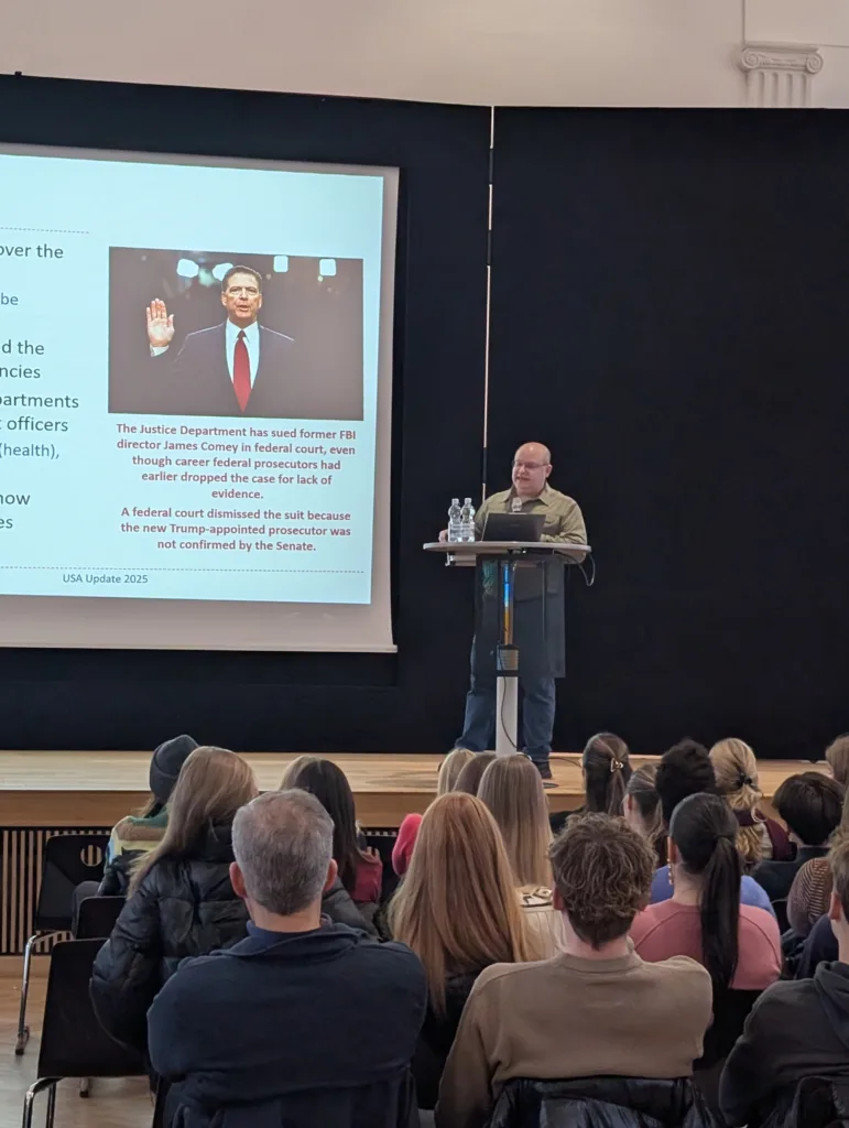 Am 18.12.2025 war mit Dr. Markus Hünemörder ein ausgewiesener USA-Experte zu Gast am Oskar-von-Miller-Gymnasium. In zwei spannenden Vorträgen für die Oberstufe beleuchtete er aktuelle politische Entwicklungen in den Vereinigten Staaten – von der Rückkehr Trumps bis zum Verhältnis von Staat und Religion. Die Veranstaltungen stießen auf großes Interesse und führten zu lebhaften Diskussionen.